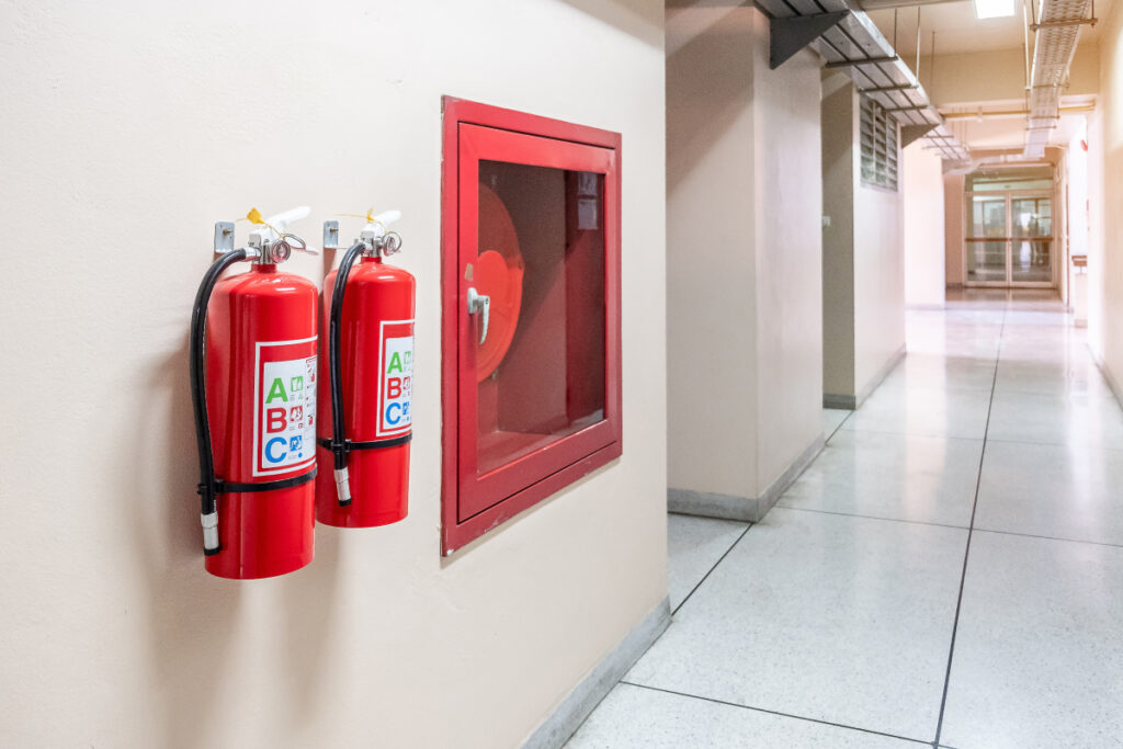 Fire extinguishers, hydrants, hose reels, and fire blankets.